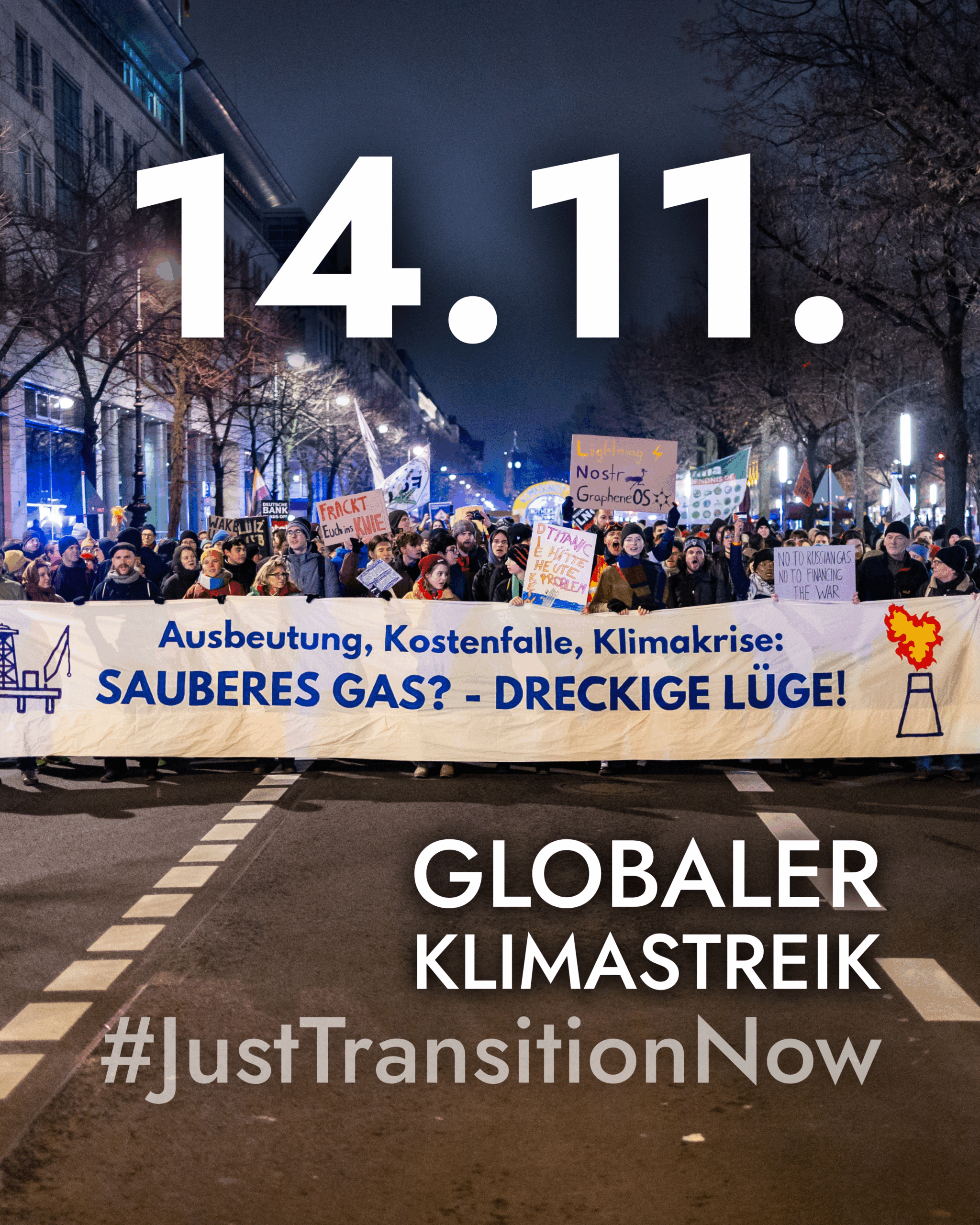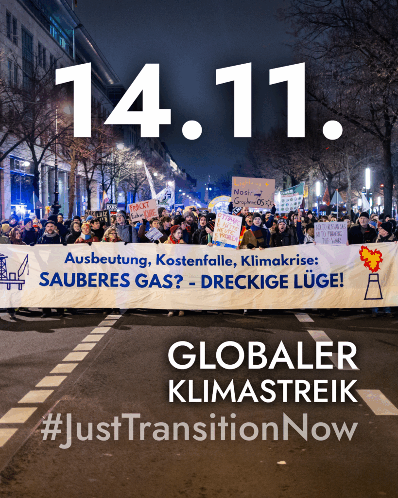 Wir haben keine Zeit mehr für leere Versprechen. Deshalb gehen wir am 14.11. weltweit und an unzähligen Orten in ganz Deutschland auf die Straße. Wir streiken – für echten Wandel, für internationale Solidarität und für eine Politik, die endlich handelt.“